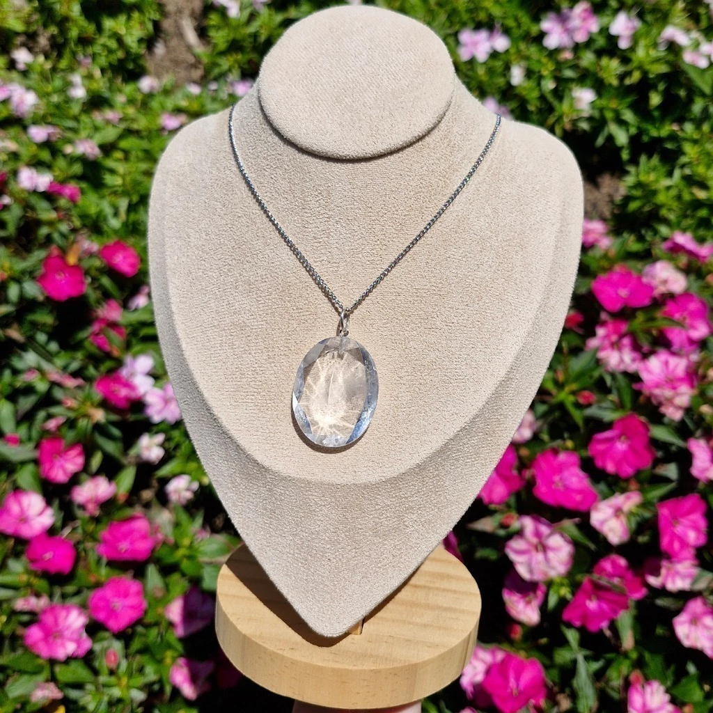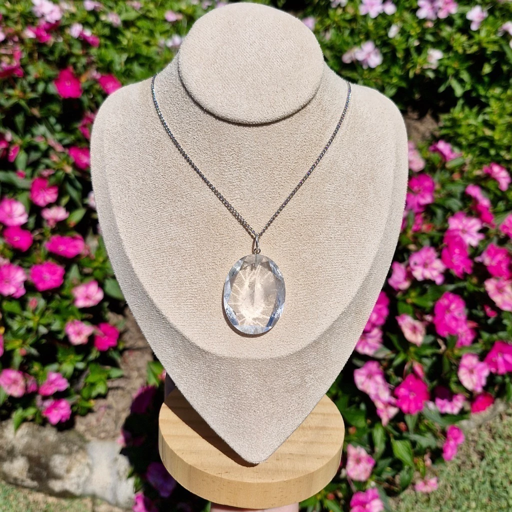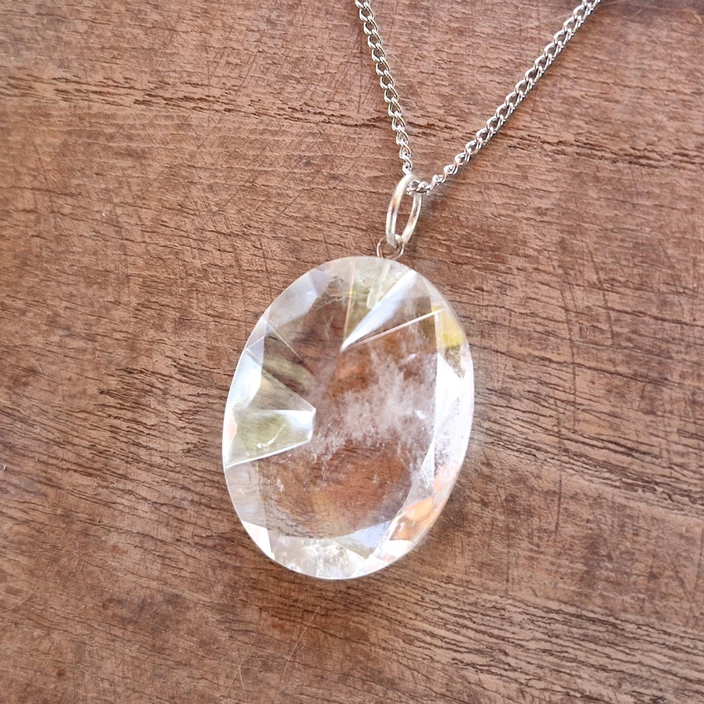 Maravilhoso Pingente em Prata 925 de Cristal de Quartzo (Facetado) + Corrente de Aço Inoxidável – Pedra Natural.
