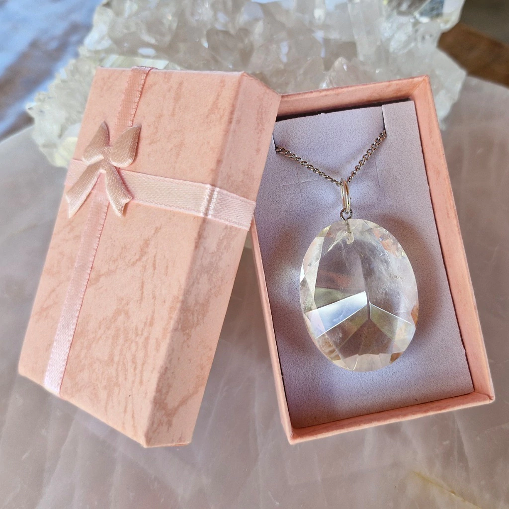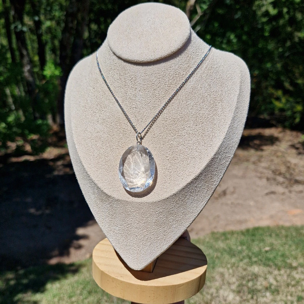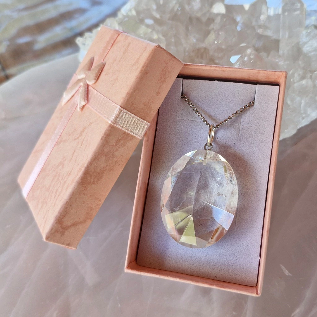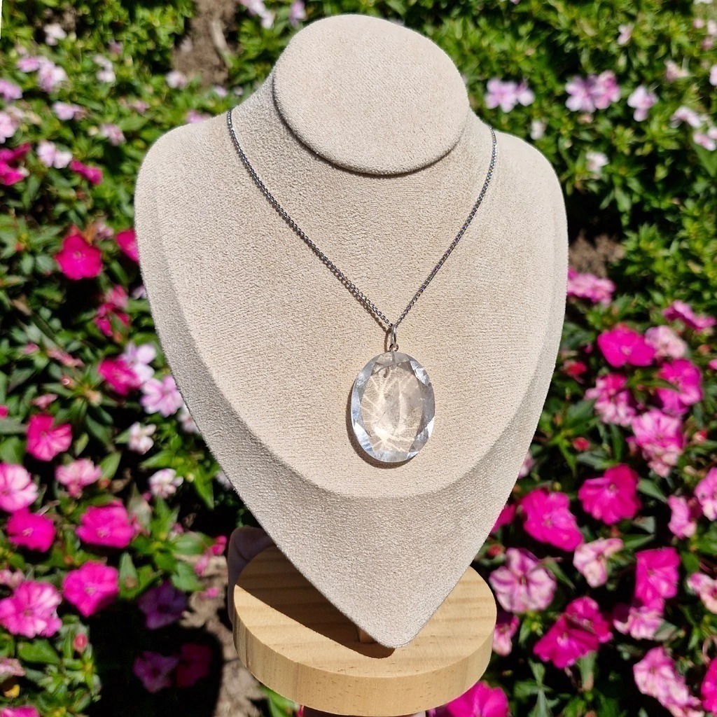 Maravilhoso Pingente em Prata 925 de Cristal de Quartzo (Facetado) + Corrente de Aço Inoxidável – Pedra Natural.