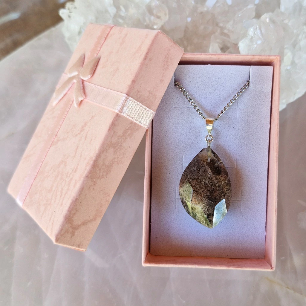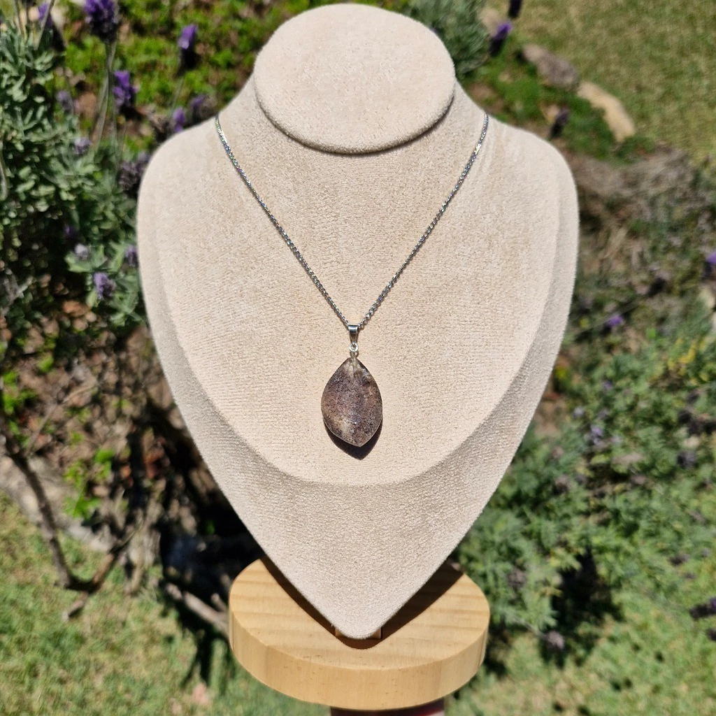 Lindo Pingente de Lodolita com Fecho de Prata 925 + Corrente de Aço Inoxidável – Pedra Natural.