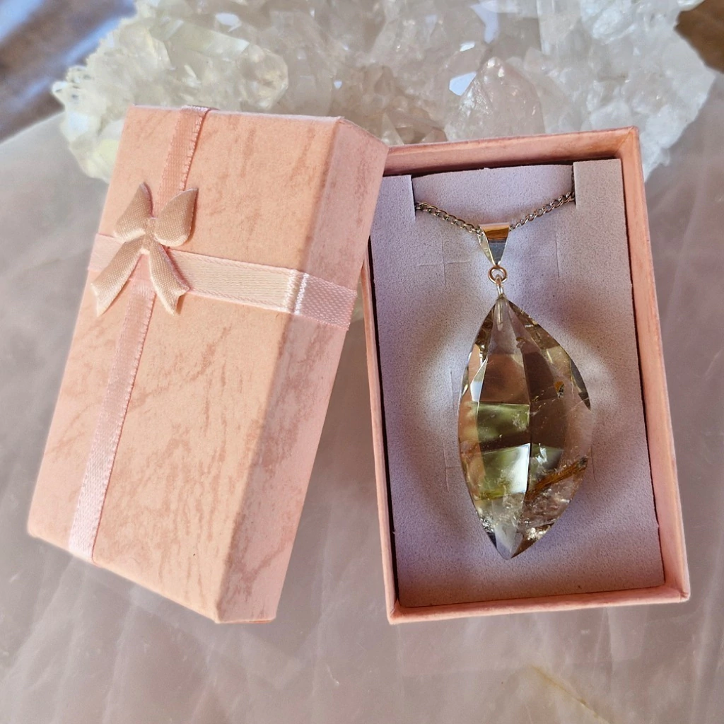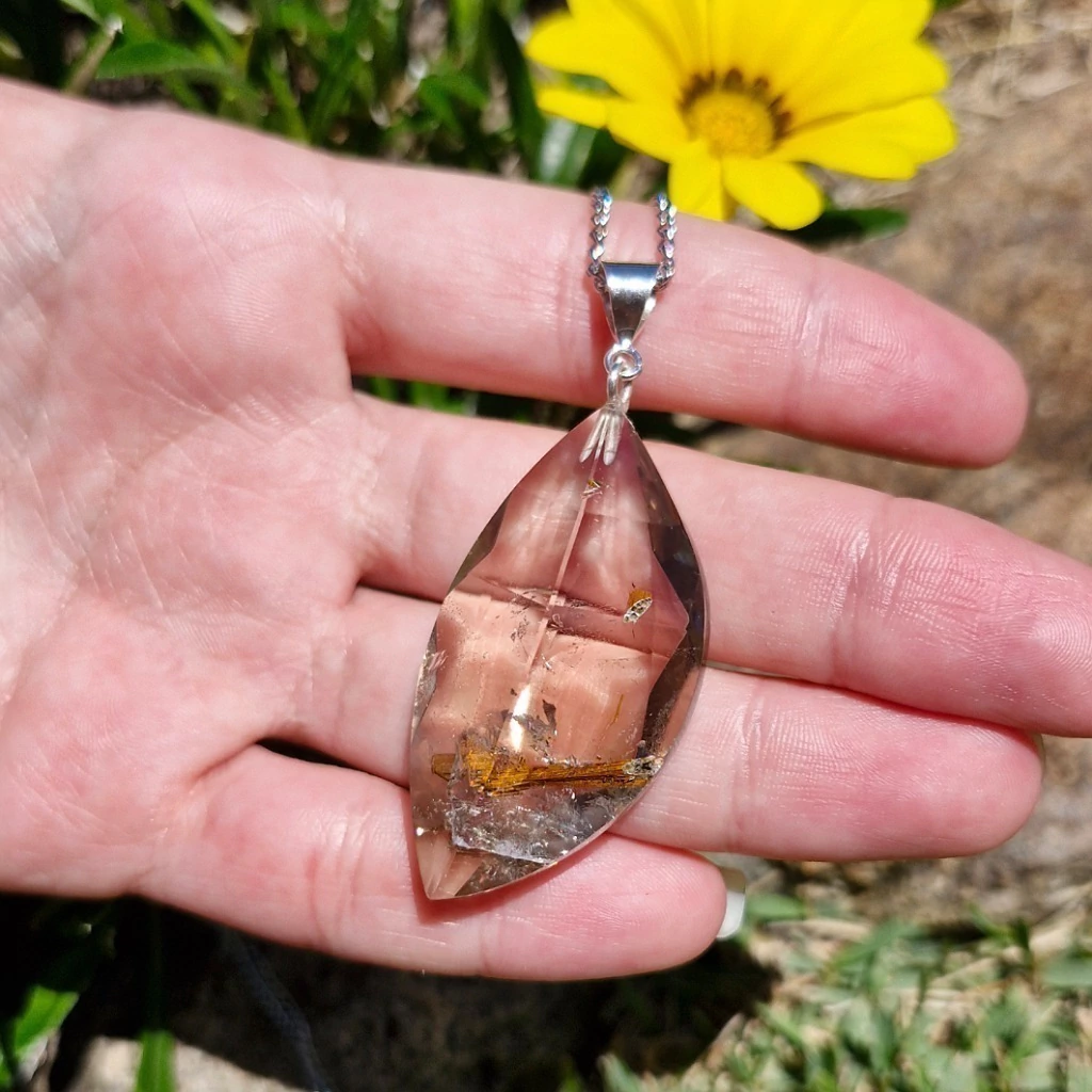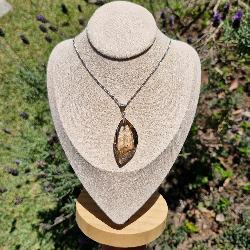 Lindo Pingente de Quartzo Fumê Rutilado Facetado com Fecho de Prata 925 + Corrente de Aço Inoxidável – Pedra Natural.