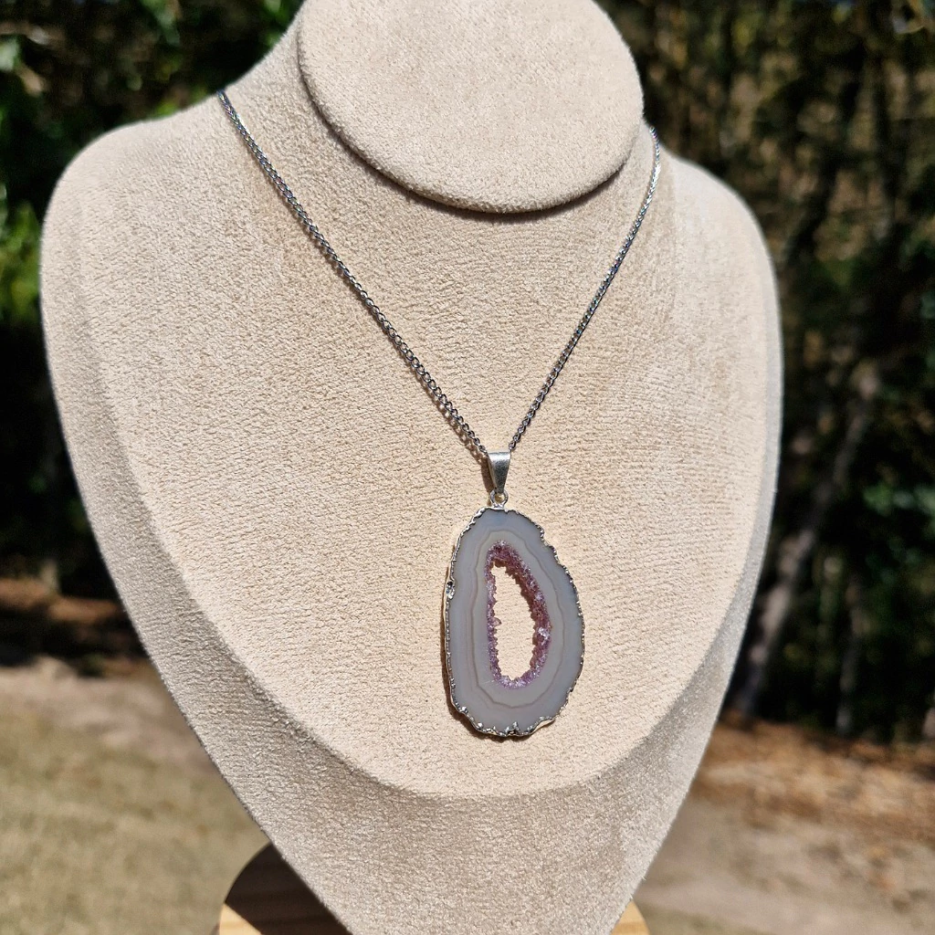 Lindo Pingente de Geodo de Ágata e Ametista + Corrente de Aço Inoxidável – Pedra Natural.